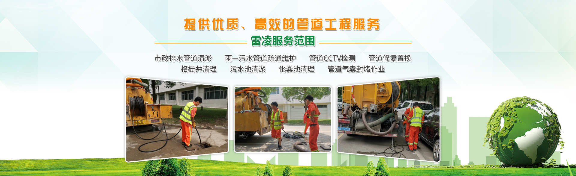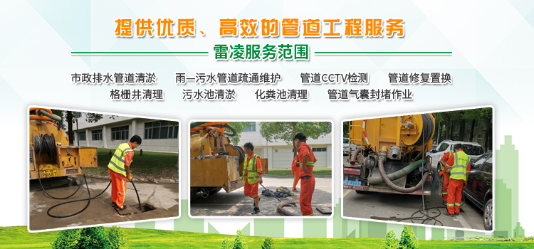 我公司专业服务范围:市政排水管网清淤检测,雨—污水管道疏通,化粪池清理,污水池清理,格栅井清理,隔油池清理、CCTV检测、管道维修养护、管道修复,等业务。主要服务对象:市政、环卫、企业、医院、学校、商场、酒店、宾馆、餐饮、饭店、小区、社区、街道办、家庭、各物业公司,以及各类建筑建设工程等。